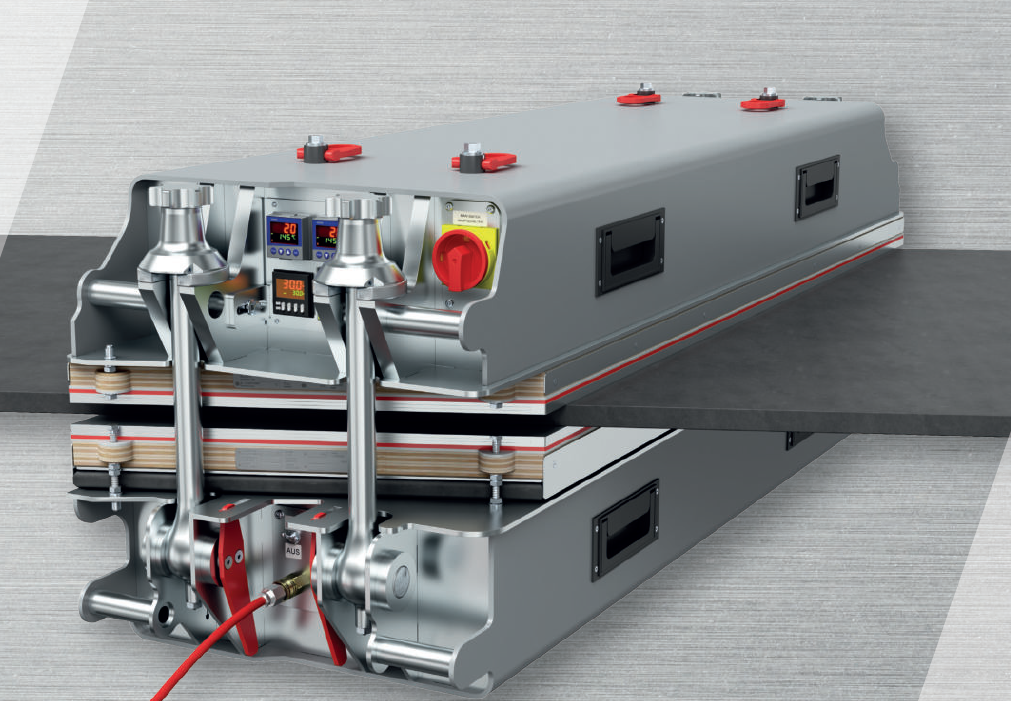 Kompakt design, många möjligheter: – Tack vare det inbyggda mutterintaget för spännbultarna hamnar spännbultarnas övre ändar i jämnhöjd med pressen. På så sätt har vi uppnått en design med låg takhöjd som ger många olika installationsalternativ. – Två vulkpressar kan enkelt placeras bredvid varandra. Det är onödigt att ta bort några obekväma komponenter. – Fällbara bärhandtag ger en särskilt bekväm hantering. – Fyra fästpunkter garanterar säker användning av kranen.